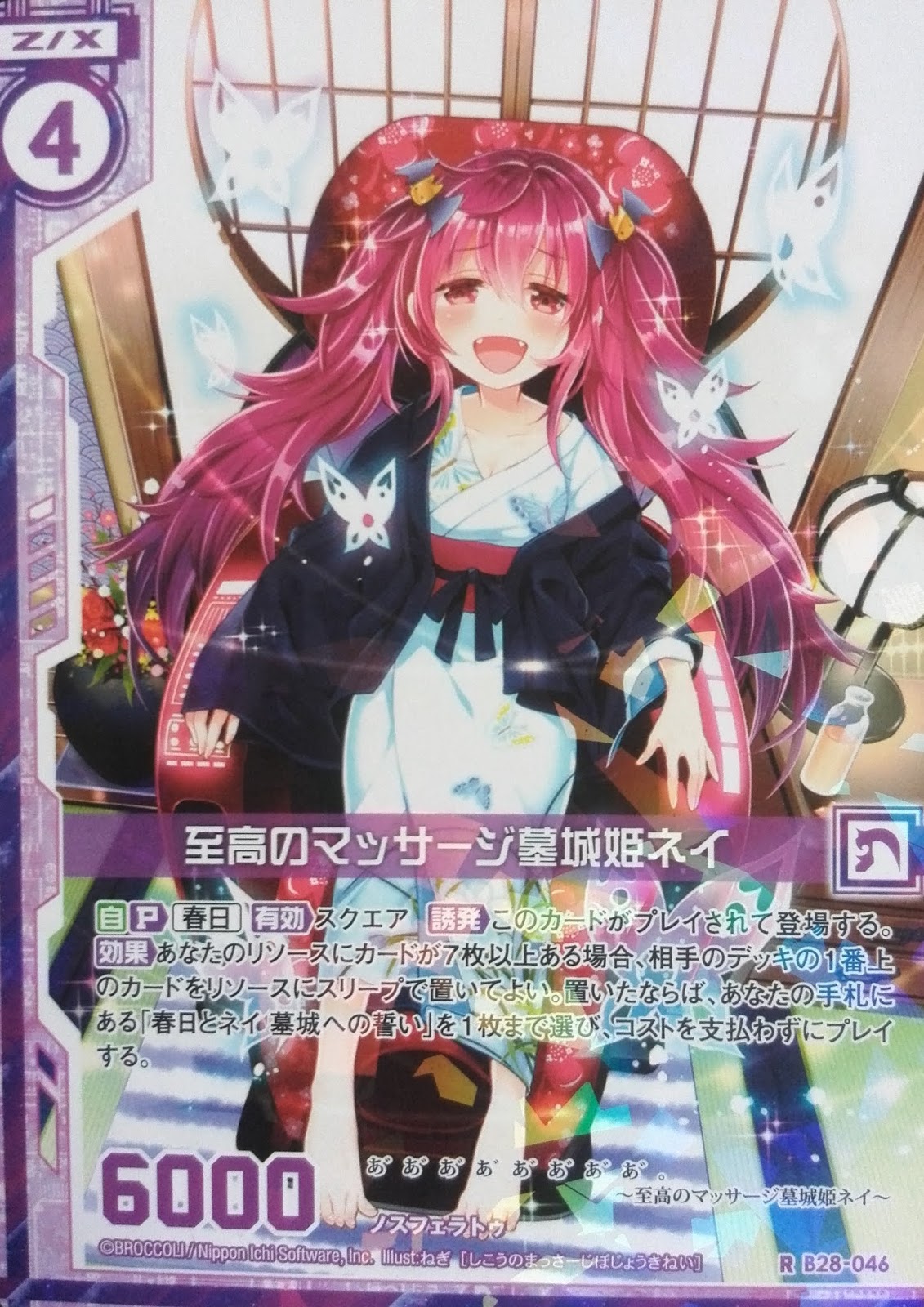 〈至高のマッサージ墓城姫ネイ〉は、リソースが7枚以上の場合、手札の墓城の「誓い」カードのコストを踏み倒せる。